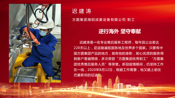遲建濤同志,2020年8月,國外新冠疫情肆虐時期,主動請纓、逆行海外至巴基斯坦進行攪拌站的安裝,成為最美“逆行者”,獨自一人在國外工地堅守近半年之久,榮獲“煙臺最美職工”榮譽稱號。